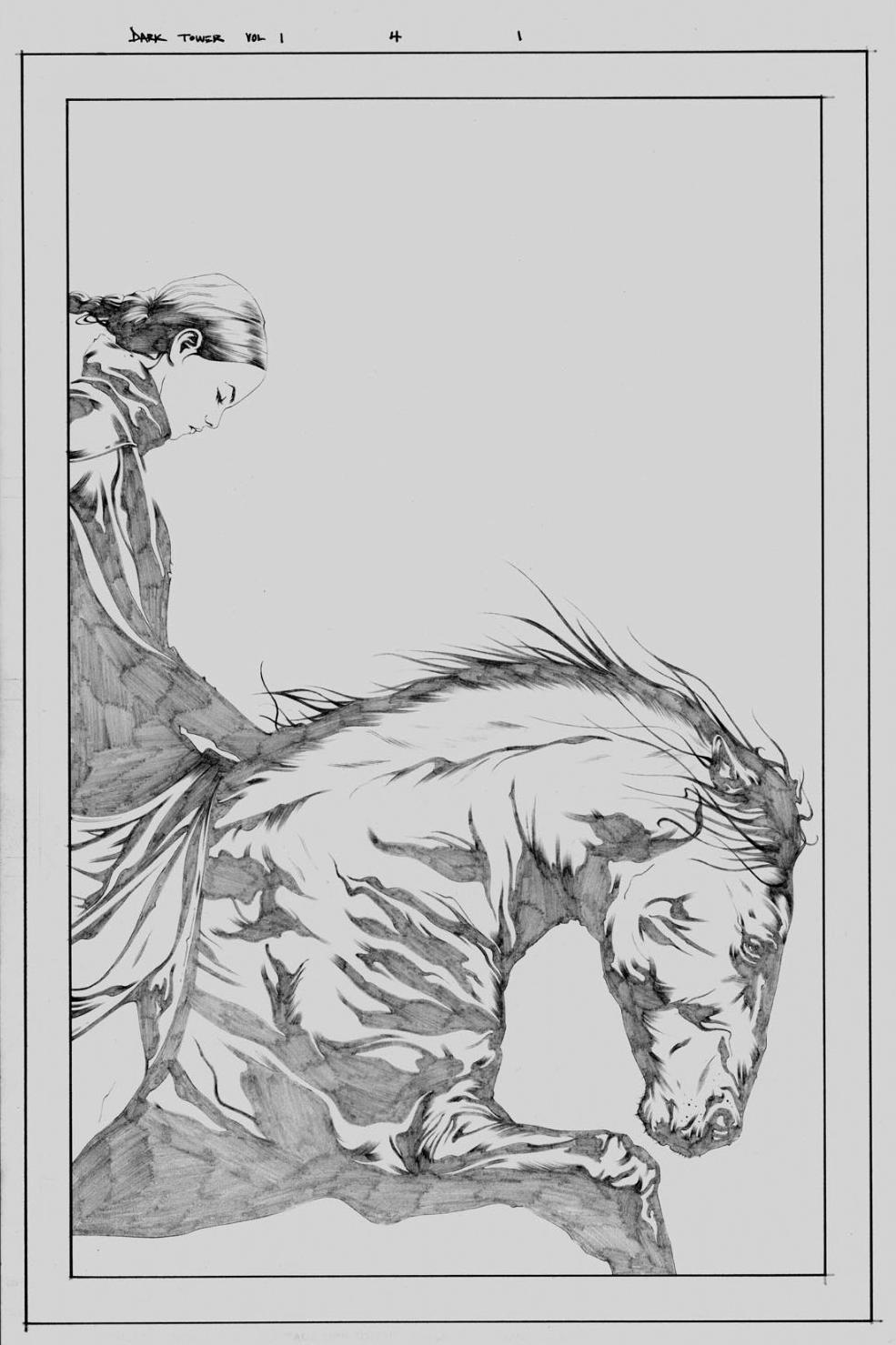 This is the original artwork to page 1 of issue 4 of Marvel's comic adaption of Stephen King's The Dark Tower series. This page from The Gunslinger Born was done by artist Jae Lee and features Susan on her horse. This art was also used as a sketch variant cover for this issue.