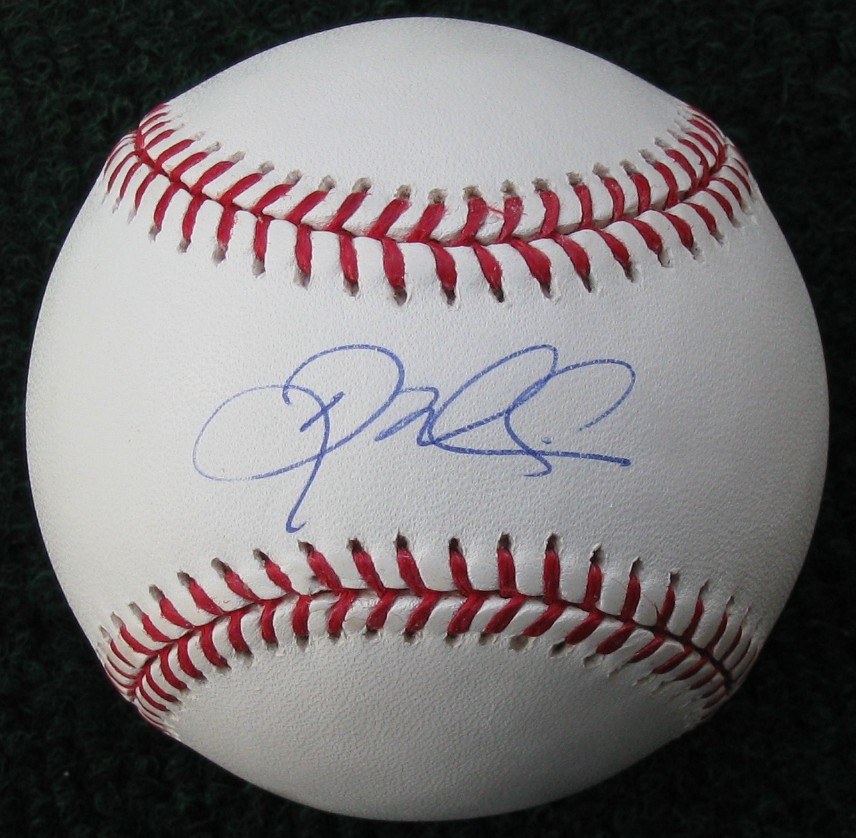 Here is a signed Doug Mientkiewicz baseball. Doug was a member of the 2004 Red Sox World Series winning team and made the last out in game 4 of the World Series. Once the World Series was over a battle over the last out baseball began.