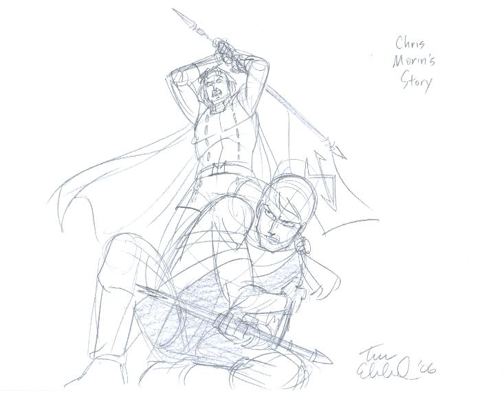 Here is a look at the next draft. To be honest Desslok does not appear to be in too much danger in this image. Plimkin looks insane but this image isn't exactly what I was looking for. I really wanted the climax of the story to be captured just before it reaches the boiling point.